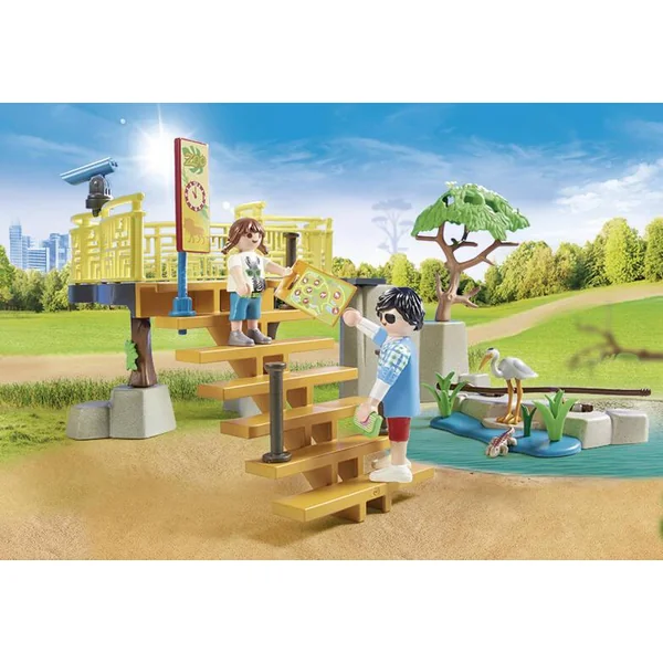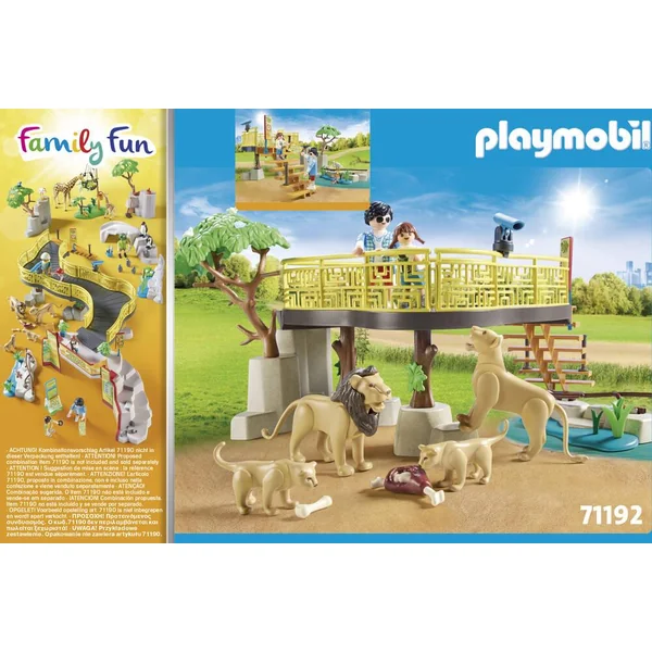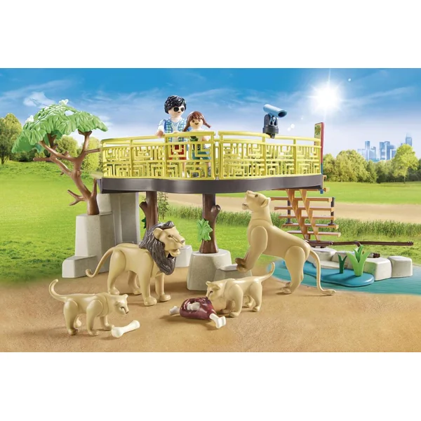 Avec 2 personnages, un lion, une lionne et son petit, des accessoires et une passerelle pour observer les animaux. 58 pièces.