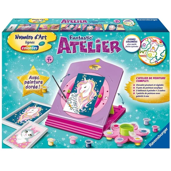 Avec Fantastic’ Atelier Numéro d’Art, c’est facile, beau et amusant de peindre par numéro grâce aux lignes colorées pré-peintes et au chevalet pivotant et réglable. Cette licorne à la crinière dorée et ce chaton entouré de cœurs dorés sauront compléter tes collections Numéro d’Art ! Son plus ? La peinture dorée pour faire briller les 2 tableaux, et qui décoreront ta chambre à merveille ! Rechargeable, le kit est compatible avec les tableaux en format mini, petit et moyen Numéro d’Art.
