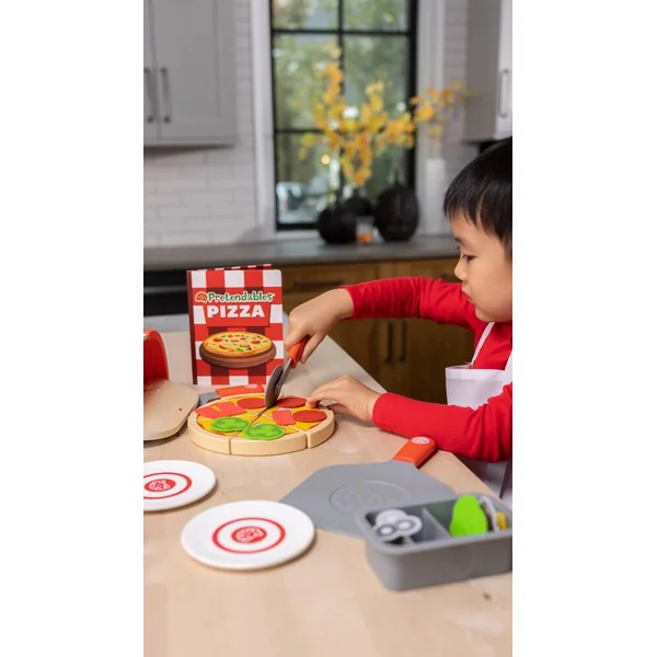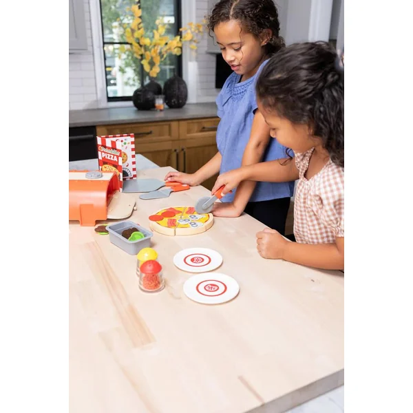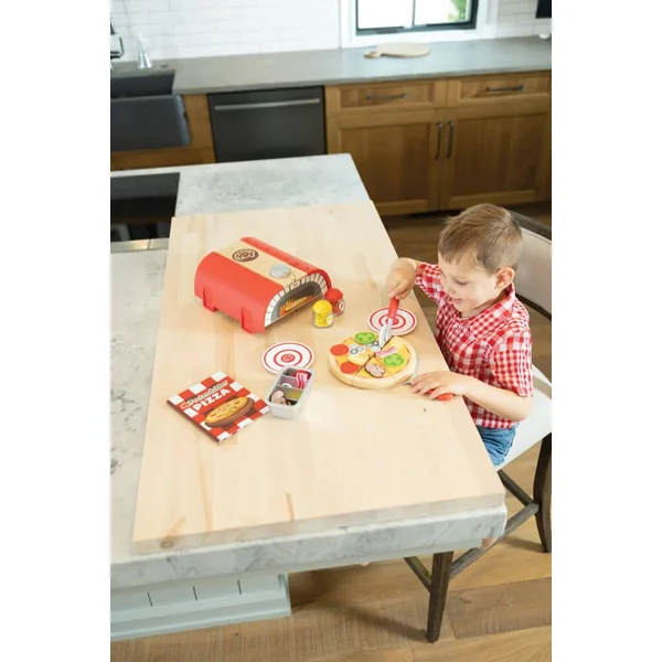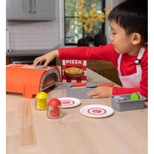 NOMBREUX ACCESSOIRES : Contient 34 pièces: 1 plaque à pâtisserie, 4 tranches de pizza, garnitures en feutre, 1 plateau, fromages, poivrons, 1 cutter, 1 spatule, 1 menu, 2 assiettes et 1 four/boîte de rangement.