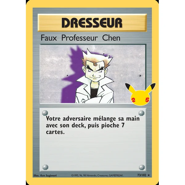 Découvrez Faux Professeur Chen (celBS 73), une carte Pokémon de l’extension Célébrations, provenant du bloc Épée & Bouclier. Idéale pour compléter votre collection, cette carte Rare plaira autant aux collectionneurs qu’aux joueurs.