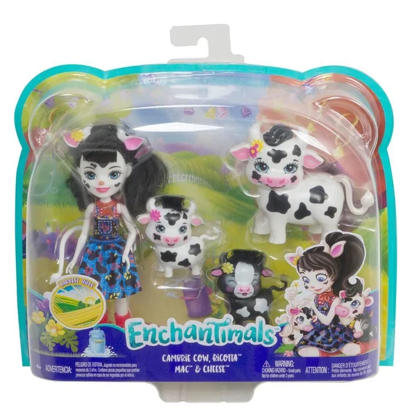 Cette famille Enchantimals de la collection Collines Fertiles inclut une poupée Cambrie Vache (15 cm), la figurine vache Ricotta et 2 figurines bébés vaches. La poupée Cambrie Vache est prête pour de belles aventures à la ferme dans sa tenue composée d’une robe-salopette avec jupe à pois amovible et de bottes de fermière rouges. La vache Ricotta et les deux petites vaches arborent chacune leur propre look vachement mignon. Contient 1 poupée avec habillage et accessoires et 3 figurines animales.