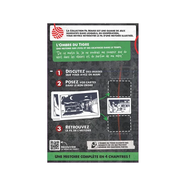 Fil Rouge, le tout premier scénario de cette gamme de jeu coopératif et narratif qui vous emportera dans des histoires riches en émotionsFil Rouge crée une expérience unique où chaque joueuse et joueur vivent et partagent une histoire. À chaque chapitre, les participant(e)s doivent retrouver le fil de l’histoire et remettre en ordre, dans la Frise, les cartes distribuées. Bien que le jeu soit conçu pour être joué une seule fois, il offre une expérience profondément enrichissante qui reste gravée dans les mémoires. Les quatre chapitres peuvent être joués consécutivement ou en plusieurs fois, vivez l’histoire à votre rythme.