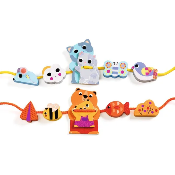 L’enfant s’amuse à enfiler les perles et lacer les planches sur les deux cordons en associant le parent et son enfant. Idéal dès 2 ans pour les premiers apprentissages de l’enfant.