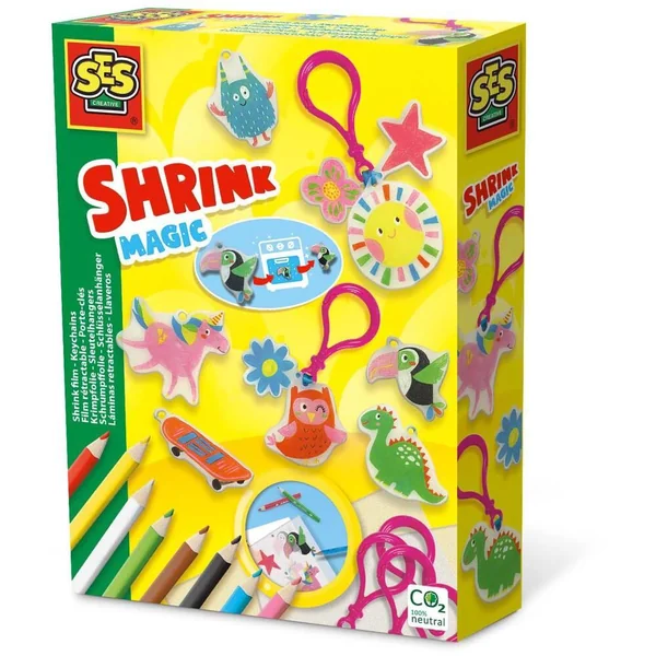 Découvre la magie du film rétractable ! Ce kit comprend tout le nécessaire pour confectionner tes propres porte-clés. Trace les exemples, colorie-les et place-les ensuite dans un four chaud. Waouh ! Regarde comme tes créations rétrécissent vite. Elles deviennent jusqu’à sept fois plus petites ! Personne n’a de porte-clés aussi uniques !