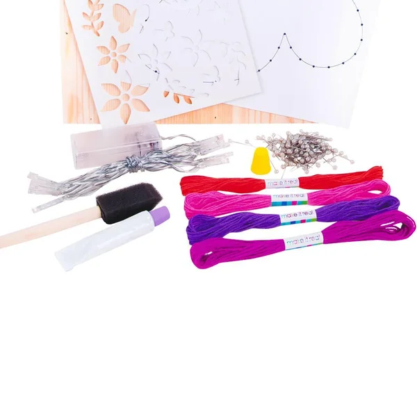 Ce coffret créatif vous permettra de créer une œuvre resplendissante. Ce coffret permet aux enfants, de créer leur propre objet de décoration. Ses petits plus, un Dream guide qui leur permettra de rencontrer une vraie décoratrice d’intérieur et une application gratuite à télécharger ‘Make it Real’ qui contient des instructions en images et en vidéo. Ce set comprend 1 toile en bois (dim. 35 x 2 x 23.5 cm), 1 dessin de papillon, 4 couleurs de fil de coton, 100 épingles, 1 dé à coudre, 1 cordon de lumière, 1 peinture en tube, 1 pinceau éponge, 1 pochoir, 1 livret d’instructions (en français, espagnol et anglais) et 1 Dream Guide.