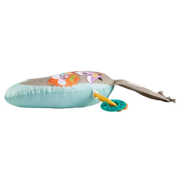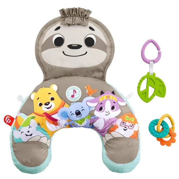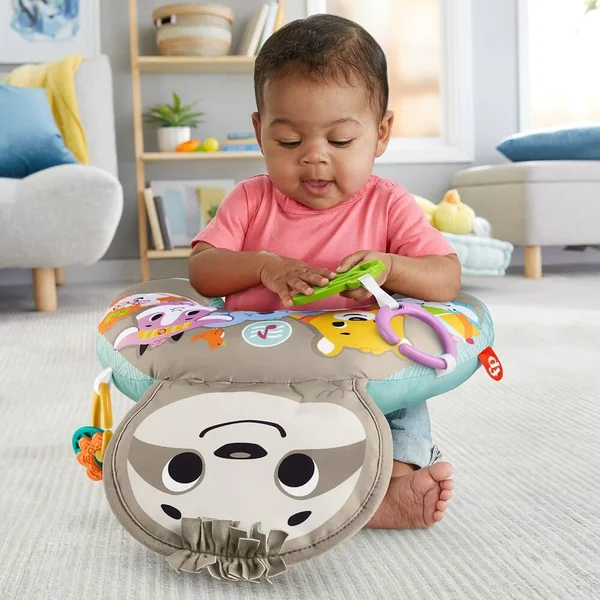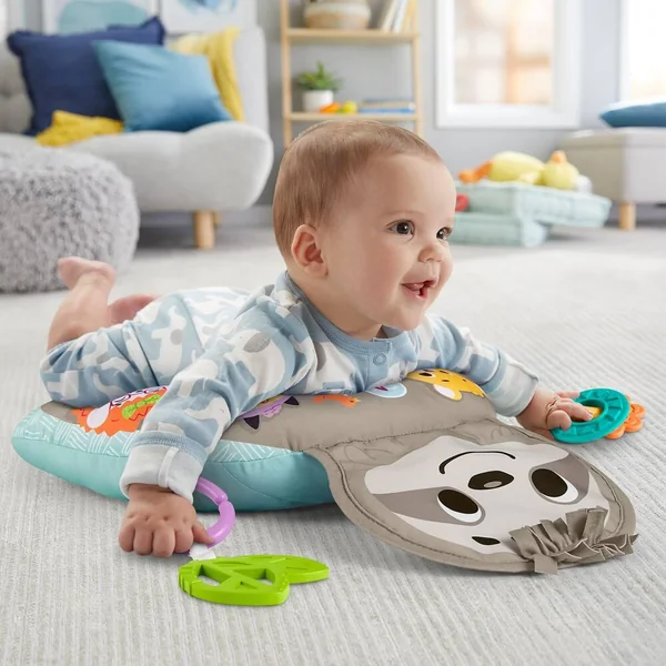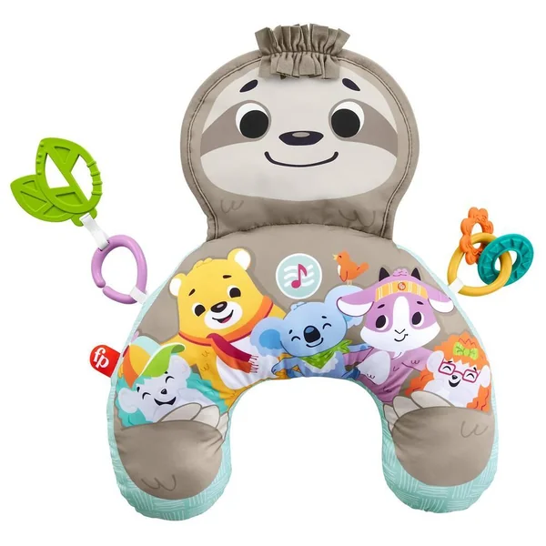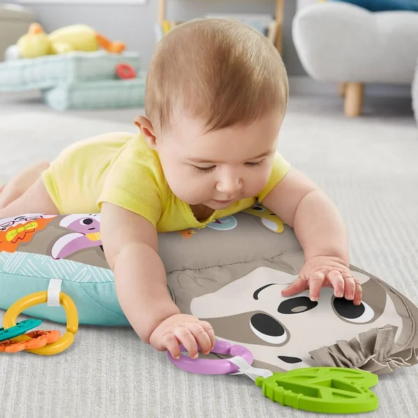Mon Coussin d’Éveil Musical de Fisher-Price aide bébé à jouer à plat ventre et l’occupe avec un grand paresseux qui crisse et diffuse de la musique, et des vibrations pendant 10 minutes pour aider à apaiser et à stimuler votre enfant lorsqu’il est sur le ventre. Les 2 jouets d’éveil, les anneaux qui cliquettent et l’anneau de dentition sans bisphénol A sont repositionnables ! En relevant la tête et le haut du corps pour attraper les jouets, bébé se muscle le cou et les abdominaux.