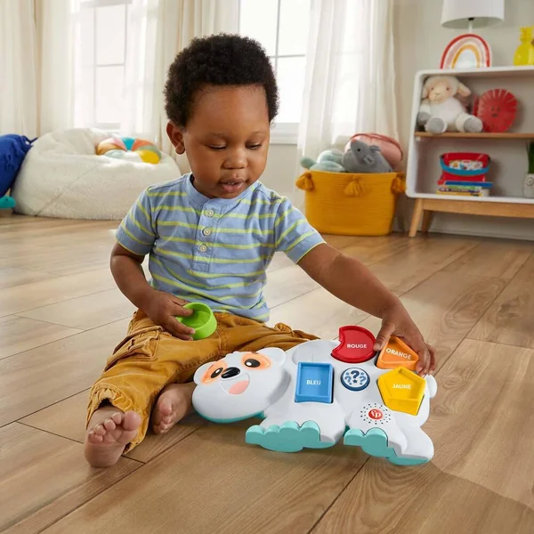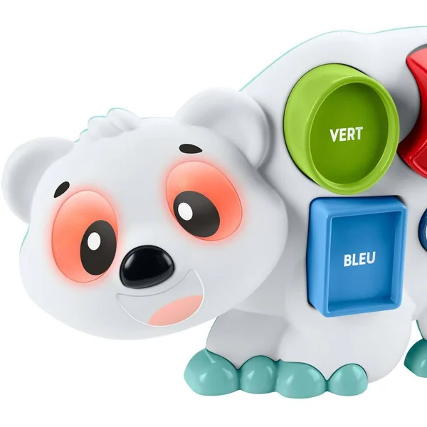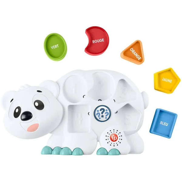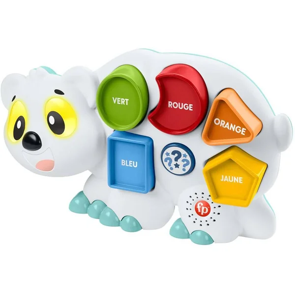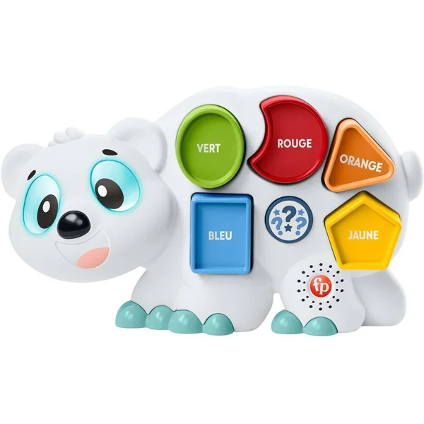 Omer l’Ours Polaire Linkimals de Fisher-Price est un jouet interactif avec lumières, chansons, sons et phrases qui se déclenchent lorsque bébé place les 5 formes dans les trous correspondants. Pour s’amuser encore plus en apprenant, l’enfant peut appuyer sur le bouton quiz et découvrir de nouvelles choses en compagnie de l’ours. Et lorsque Omer l’Ours Polaire rencontre d’autres amis Linkimals, ils peuvent s’illuminer, parler, chanter et jouer en chœur !