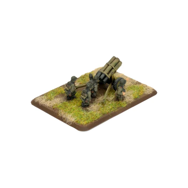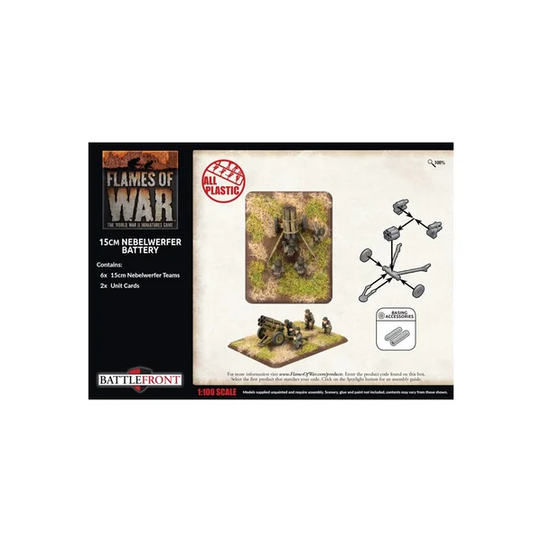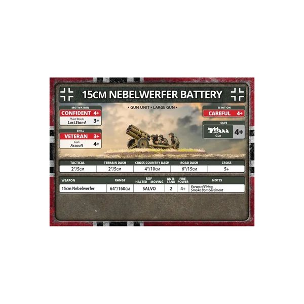 Cette boîte de 15cm Rocket Launcher Battery contient six Nebelwerfers en plastique, trois 3 grappes plastiques et deux cartes d’unité.