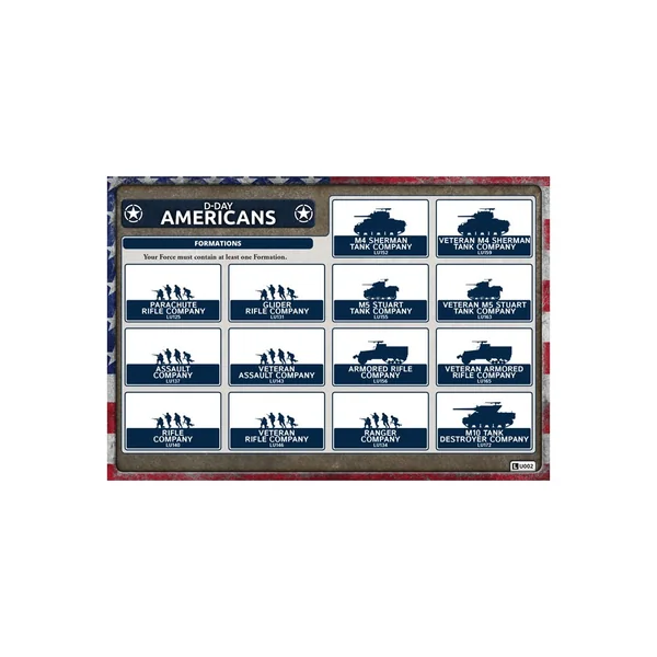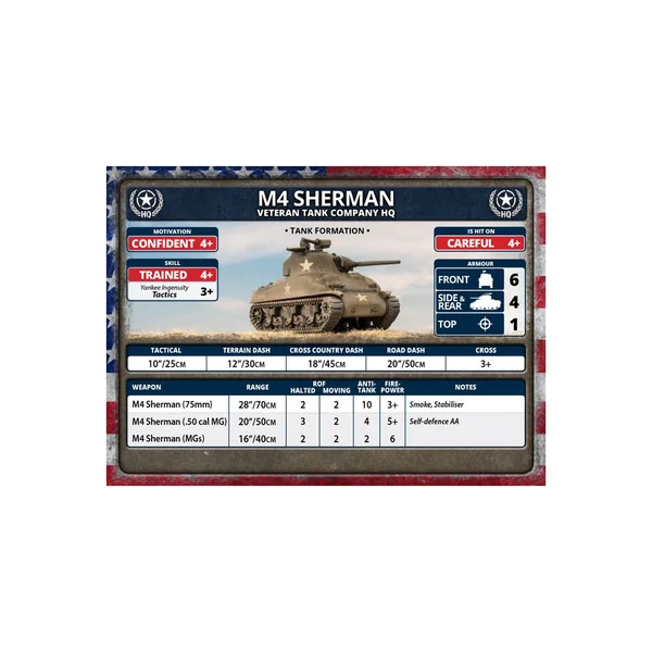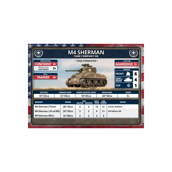 Cette boîte contient 5 Sherman M4 (75 ou 76mm) en plastique, une grappe de commandants de char, une planche de décalcomanies et 8 cartes d’unités.