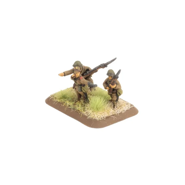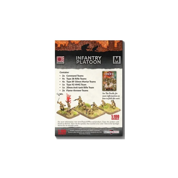 Le fusilier japonais a bénéficié d’un régime d’entraînement ciblé qui met l’accent sur les aspects spirituels du combat, tels que la certitude de la victoire, la loyauté et le devoir patriotique. L’esprit de l’offensive est inculqué à chaque soldat et l’entraînement tactique se concentre sur le combat d’infanterie et le combat au corps à corps. Le peloton d’infanterie moyen est armé soit du fusil de 6,5 mm de type 38, soit du fusil plus puissant de 7,7 mm de type 99. Les pelotons d’infanterie sont aussi généralement armés d’un lance-grenades de 50 mm de type 89, également connu sous le nom de « mortier à genoux ». Ce surnom américain est basé sur l’idée fausse que l’arme peut être tirée à partir d’une position agenouillée en plaçant la plaque de base incurvée sur la cuisse – une idée fausse qui a conduit au moins un soldat américain à subir une fracture ouverte du fémur !