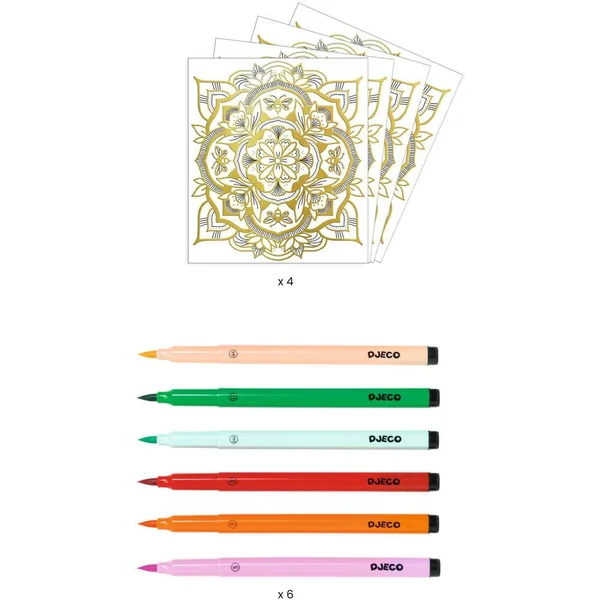 Ce kit propose une activité de coloriage dans un thème mandala et floral. Grâce aux feutres pinceaux fournis dans le set, l’enfant met en couleurs les 4 saynètes agrémentées d’un vernis dorés. Pratiques, les cernés or en relief facilitent le coloriage : ils guident la pointe du feutre pour éviter de mélanger les couleurs ! Ce coffret fait partie de la gamme Artistic une collection de mini coffrets proposant différentes techniques de création.