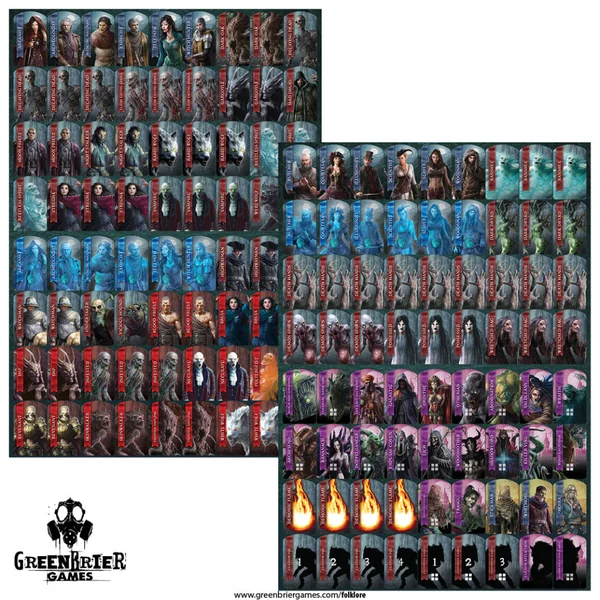Planches contenant des standees pour le jeu de base Folklore: The Affliction et pour l’extension Dark Tales. Chaque planche à découper comprend 72 standees, pour un total de 144 standees.