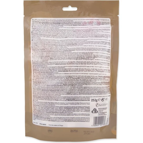 Pour les plus petites races, gardez le chien sous surveillance, donnez la friandise en deux fois pour éviter qu’il ne mange toute la partie de peau de bœuf d’un coup.