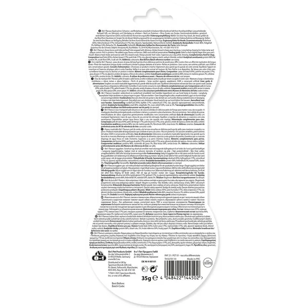 Composition : viande et sous-produits d’origine animale (52 % de peau de boeuf, 25 % de peau de porc, 8 % de poitrines de poulet), sous-produits d’origine végétale, minéraux.