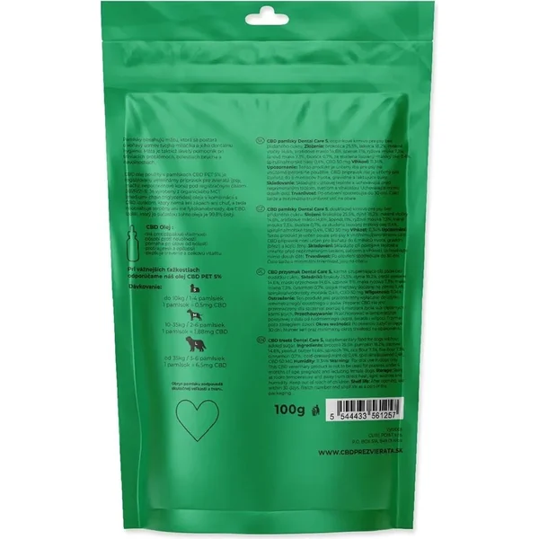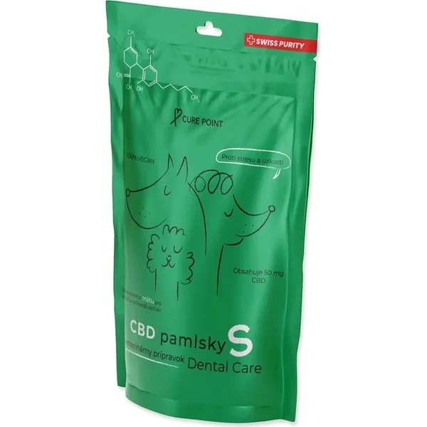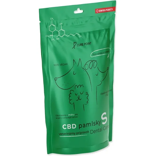 Préparation vétérinaire pour chiens de moins de 10 kg contenant du CBD (Cannabidiol). Le produit est enrichi en menthe, qui a un effet antiseptique et rafraîchit l’haleine du chien. La menthe aide également en cas de troubles digestifs, de douleurs abdominales et de nausées.