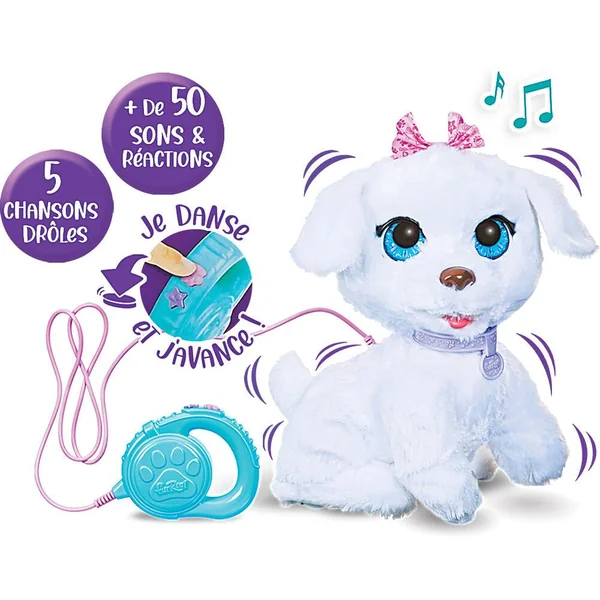 GoGo mon chiot qui danse de furReal fera danser les amoureux des animaux. Mignonne et interactive, GoGo la peluche dansante électronique est vendue avec une laisse automatique facile à utiliser. On appuie sur le bouton Dance de la laisse pour que le chiot se lève sur ses pattes arrière et danse en jouant 5 chansons différentes. On appuie sur le bouton Marche de la laisse pour promener GoGo et l’entendre émettre des sons amusants. Avec plus de 50 sons et réactions, cette peluche animatronique déborde de surprises. Gogo marche, se dresse sur ses pattes et danse sur ses 5 chansons incluses ! 1 laisse fournie.