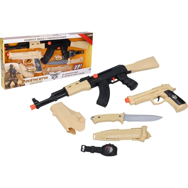 Le mitrailleur et les pistolets émettent des sons acoustiques lors de la pression sur la gâchette, sans batteries. Le mitrailleur se charge avec un levier sur le côté gauche.
