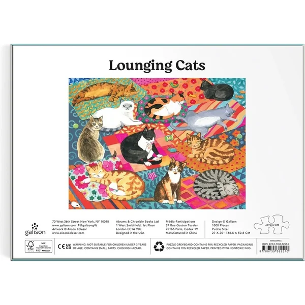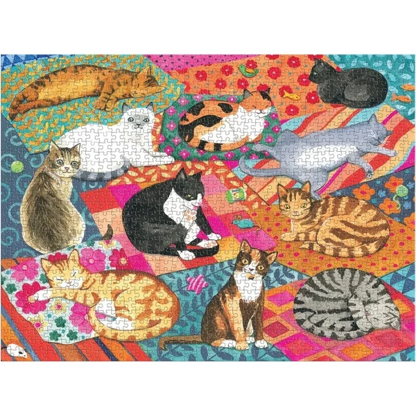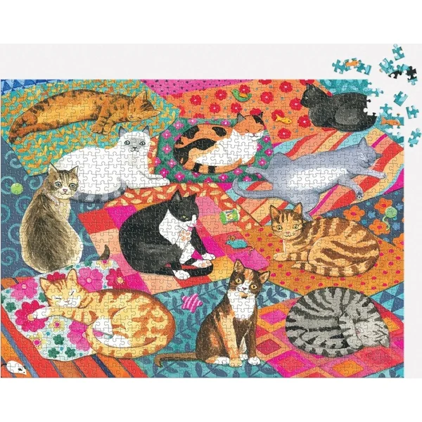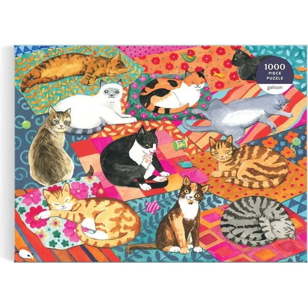 Le puzzle de 1000 pièces représente une variété de compagnons félins se prélassant sur des couvertures et des coussins colorés. L’illustration est réalisée par l’artiste et illustratrice Alison Kolesar. Idéal pour tous les amoureux des chats et les passionnés de puzzles !