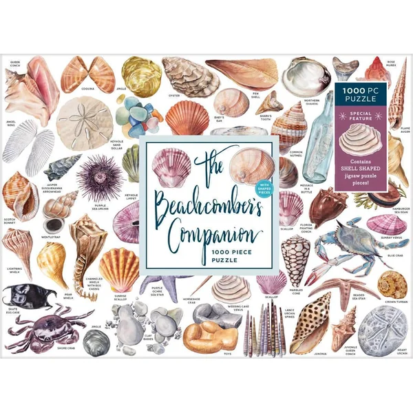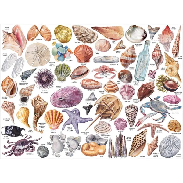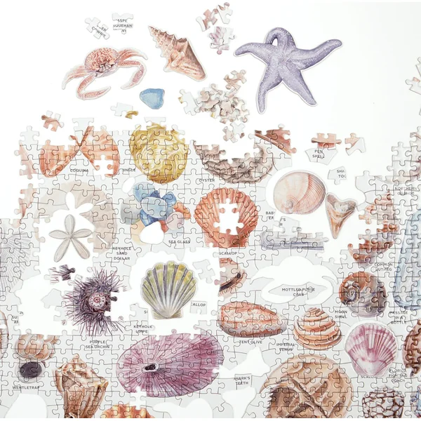 Un puzzle utilisant les licences de l’œuvre The Beachcomber’s Companion [Le Guide du flâneur de plage] d’Anna Marlis Burgard, célèbre voyageuse et écrivaine américaine, mais aussi auteure de projets multimédias. Il représente des coquilles des plus divers animaux, mais aussi d’autres trésors que vous pouvez rencontrer lors de vos promenades sur les plages. Certains des objets sont réalisés sous forme de pièces individuelles aux formes étranges, qui apportent un élément rafraîchissant à l’assemblage. Les illustrations sont de Jillian Ditner, une illustratrice scientifique connue pour son travail principalement en Amérique du Nord.