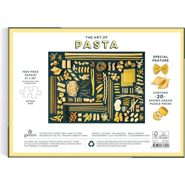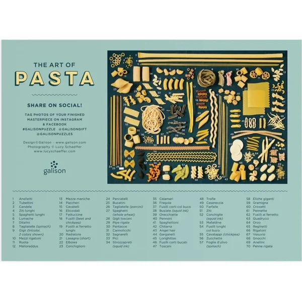 Le puzzle avec des pièces en forme de pâtes contient de nombreux types de pâtes, des spaghetti, des papillons et d’autres. Ce puzzle comprend également 20 pièces de puzzle en forme de pâtes pour encore plus de plaisir. Le puzzle est emballé dans une boîte solide, pour une réutilisation et un stockage. Idéal comme cadeau. L’auteur de l’image est Lucy Schaeffer.
