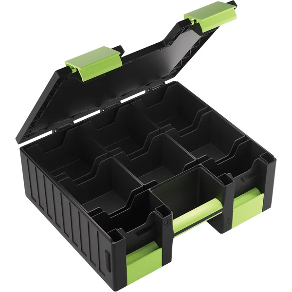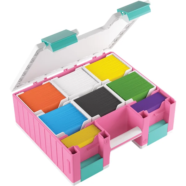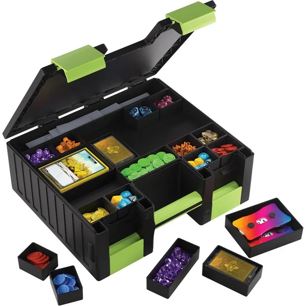 Les plateaux sont interchangeables avec ceux du Token Silo de Gamegenic, offrant de nombreuses combinaisons de tailles et de couleurs. Le mécanisme de clips innovant assure une fermeture précise et sécurisée.