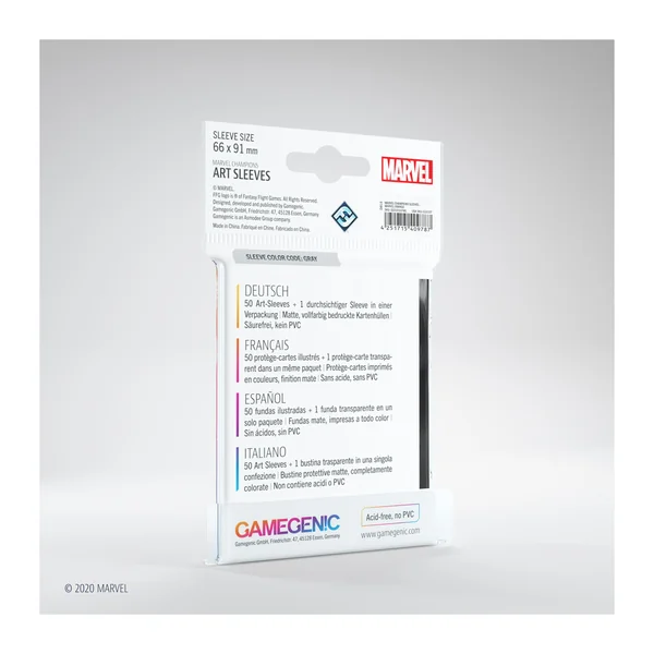 Chaque paquet contient 50 sleeves à l’effigie des héros Marvel, conçue spécialement pour le jeu Marvel Champions : Le Jeu De Cartes. Elle contient également une pochette transparente supplémentaire pour le héros/vilain.