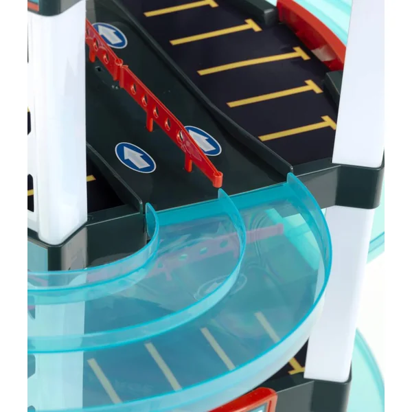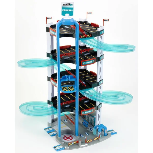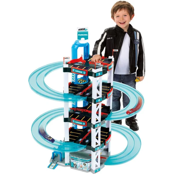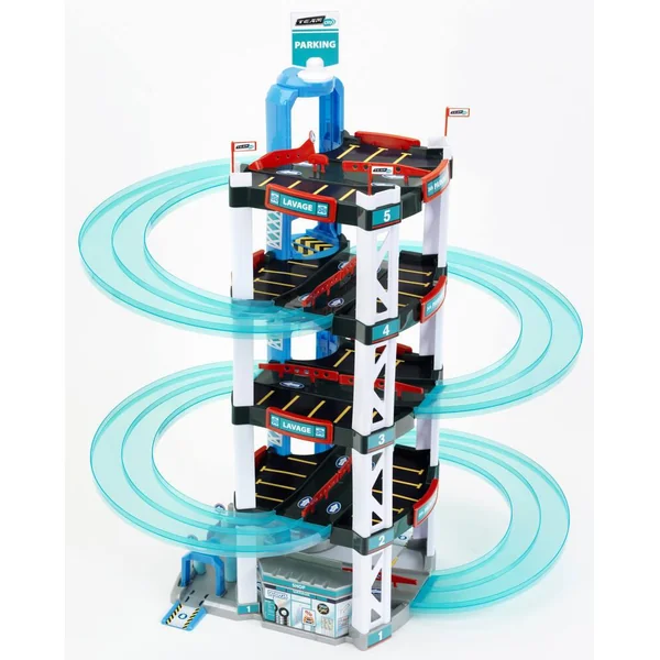 Ce très beau garage Team City, solide et stable, compte 5 niveaux ! De quoi réaliser des courses sensationnelles ! Il comporte également : des doubles pistes qui peuvent être retournées afin de laisser place à une piste unique pour de plus grandes voitures, de nombreuses places de parking, un ascenseur manuel pour monter et descendre les voitures, une station de lavage, une station-service. Livré avec deux petites voitures. Dimensions garage : 55 x 55 x 85 cm. Voitures roues libres, en métal et plastique. Dim. d’1 voiture : L. 7.5 x l. 3 cm. Notice d’assemblage. Avec autocollants inclus. Garage extraordinaire, résistant, facile à monter et très stable. Ascenseur pour 2 voitures. Double rampe pour deux voitures. Rampe unique pour grosse voiture.