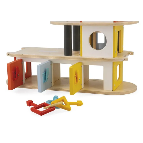 Un vrai garage fonctionnel qui s’ouvre grâce à des clés adaptées et des serrures géométriques qui rendent chaque porte unique. Des heures de jeu garanties avec ce garage en bois, ses 3 voitures et son hélicoptère.