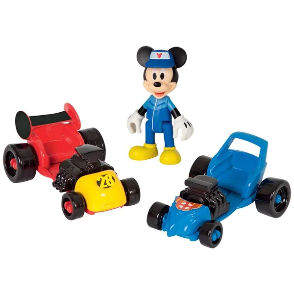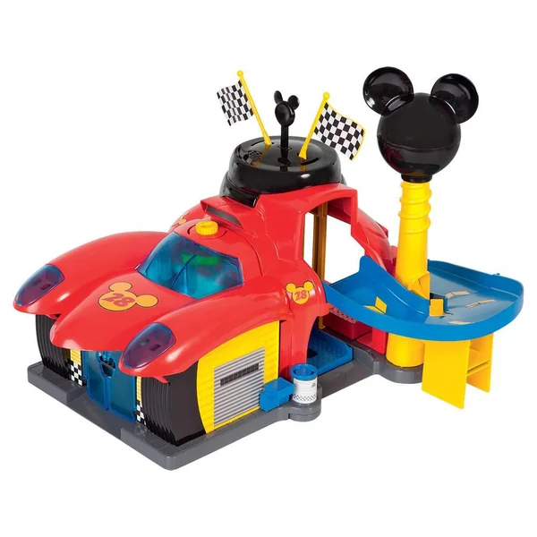 Le garage de Mickey et ses amis. Comprend 1 figurine mickey articulée, 2 voitures transformables de Mickey et Donald, et de nombreux accessoires (drapeaux, pompe à essence…) Système d’ouverture et de fermeture du garage. Avec effets sonores et lumineux.