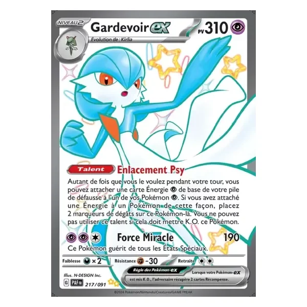Découvrez Gardevoir (paf217), une carte Pokémon de l’extension Destinées de Paldea, provenant du bloc Écarlate & Violet. Idéale pour compléter votre collection, cette carte Shiny Ultra Rare plaira autant aux collectionneurs qu’aux joueurs.
