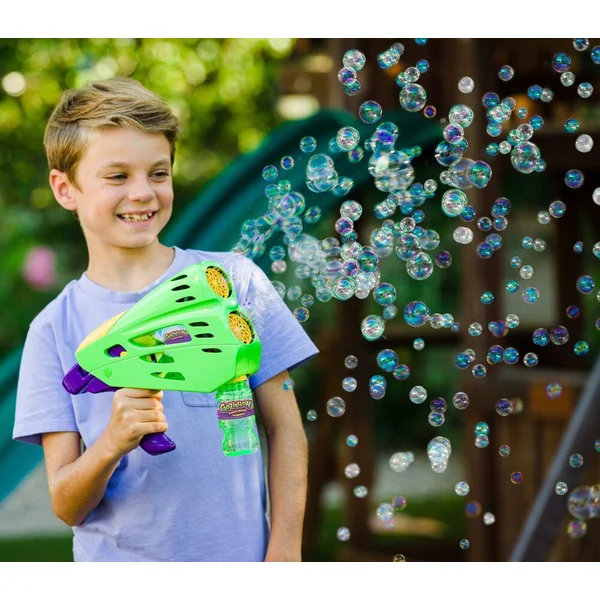 Le Double Bubble Blaster est un produit 2 EN 1 qui souffle des milliers de bulles colorées !