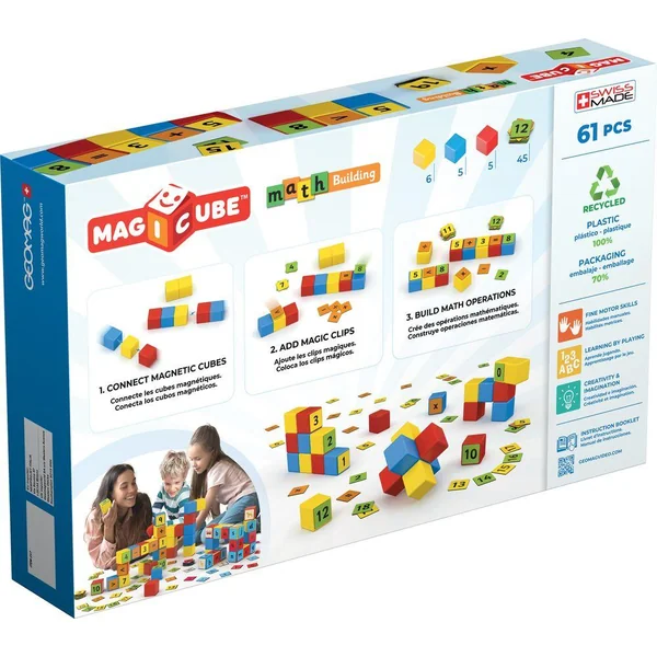 Le pack Maths Building offre une variété considérable de clips incluant des chiffres, des points et des symboles pour faciliter l’apprentissage de l’arithmétique. Les blocs de construction sont produits à partir de plastique entièrement recyclé !