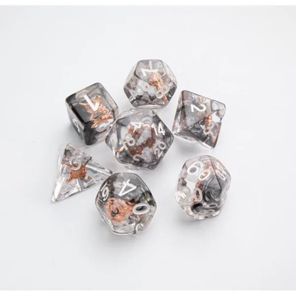 Choisis ton arme! Ce jeu de dés contient un D4, un D6, un D8, deux D10 (10 et 00), un D12 et un D20. Tous les dés sont à coins arrondis et fabriqués à un niveau supérieur. Les Embraced Dice ont un objet intéressant à l’intérieur du cube et feront de votre soirée de jeu un coup critique. Ils sont emballés dans une boîte en carton à fenêtre qui affiche tous les dés à l’avant.
