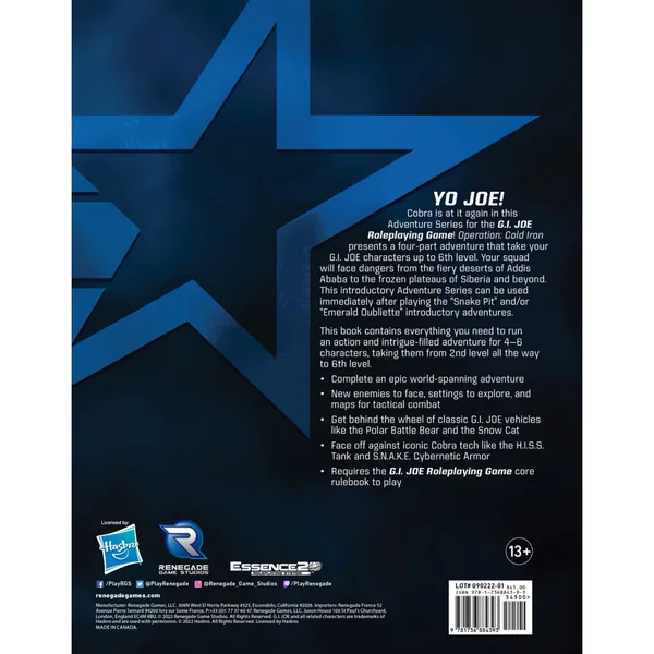 Reprenant là où Emerald Oubliette s’arrête, cette aventure en quatre parties emmène 3 à 6 personnages G.I. JOE du niveau 2 jusqu’au niveau 6. Cette aventure emmène votre escouade des déserts brûlants d’Addis-Abeba aux plateaux gelés de Sibérie.