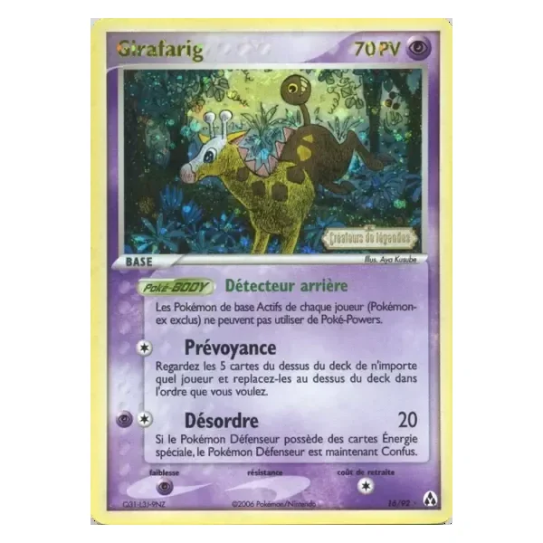 Découvrez Girafarig (lm016), une carte Pokémon de l’extension Créateurs de Légendes, provenant du bloc Ex. Idéale pour compléter votre collection, cette carte Rare plaira autant aux collectionneurs qu’aux joueurs.