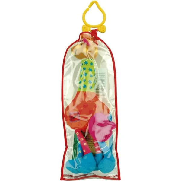 La girafe à suspendre au landau ou au-dessus du berceau attire visuellement, tactilement et auditivement les sens de l’enfant. La girafe est fabriquée à partir de différents matériaux.