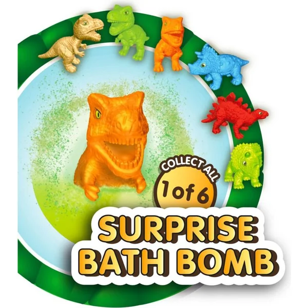 Bombes de bain effervescentes en trois couleurs (bleu, vert, orange) avec une surprise – dans la boule effervescente se cache l’un des 6 dinosaures.