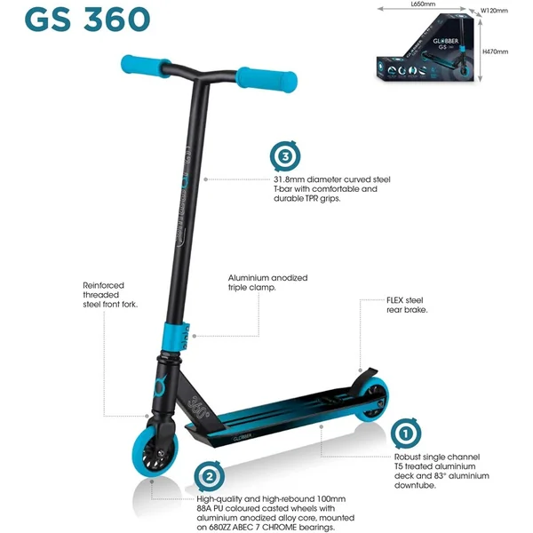 Vivez vos premières balades, sauts et tricks avec la trottinette Globber GS 360 Stunt, qui possède toutes les fonctionnalités essentielles dont les jeunes athlètes ont besoin pour apprendre les bases de ce sport émergent.