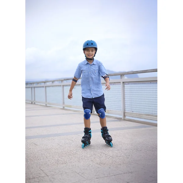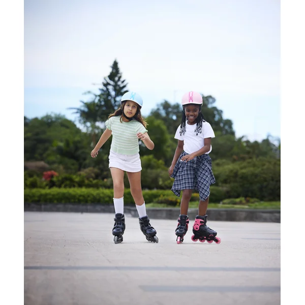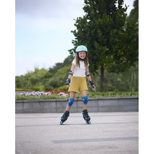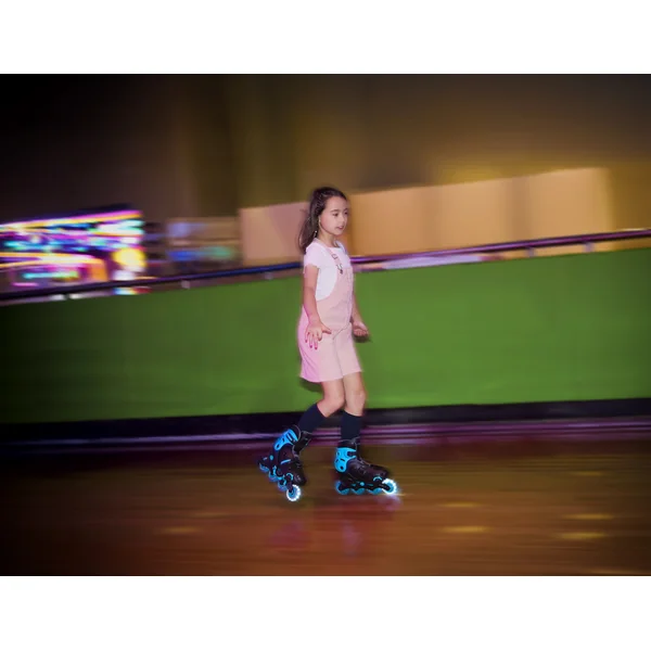 Le mécanisme de régulation de la vitesse (speed-safe) permet aux enfants d’augmenter leur rythme de manière contrôlée et d’apprendre à patiner en toute sécurité. Le réglage de la taille est 100 % sans outils — grâce à des boutons de réglage de la longueur et des bandes de fixation supplémentaires, les patins s’adaptent rapidement et facilement aux pieds en croissance. La chaussure confortable combinée à un frein en matériau TPR à l’arrière de chaque patin assure un arrêt sécurisé. Un élément marquant est les roues avant avec éclairage LED sans batteries — elles s’illuminent en mouvement et ne nécessitent aucun chargement ni remplacement de piles.