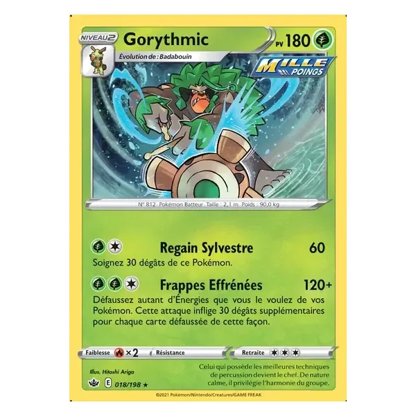 Découvrez Gorythmic (cre018), une carte Pokémon de l’extension Règne de Glace, provenant du bloc Épée & Bouclier. Idéale pour compléter votre collection, cette carte Holo Rare plaira autant aux collectionneurs qu’aux joueurs.