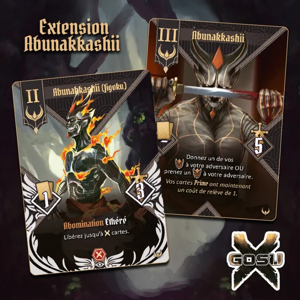 Abunakkashii est une extension pour Gosu X qui met à l’honneur un nouveau clan de démons et d’êtres corrompus. Elle contient 15 cartes formant le clan d’Abunakkashii ainsi que des cartes altérées et des jetons spécifiques aux nouvelles mécaniques.