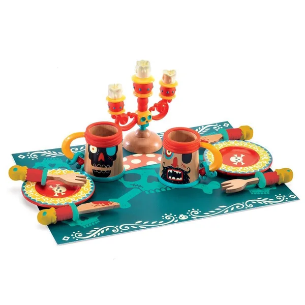 Comprend un chandelier, deux chopes pirates, deux assiettes, des couteaux et fourchettes…