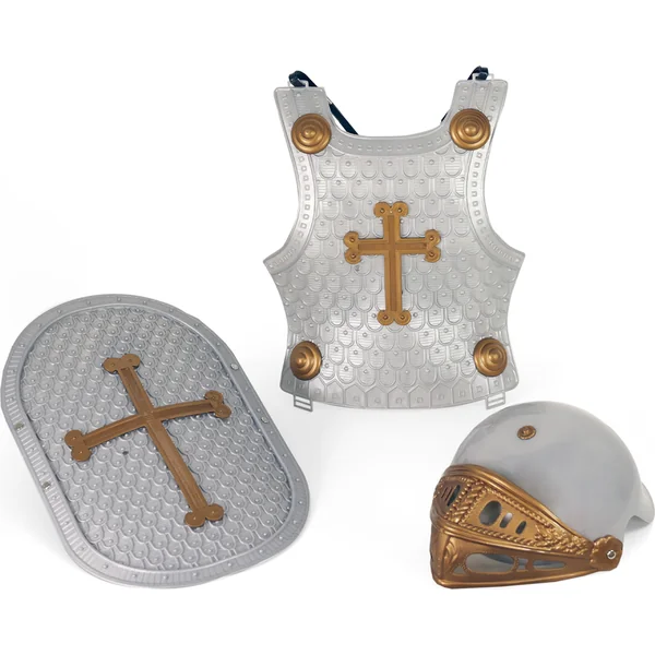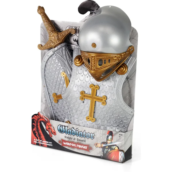 • L’emballage contient une épée en bronze dans un fourreau argenté, un bouclier de protection, un casque avec une visière réglable et une cotte de mailles de chevalier.