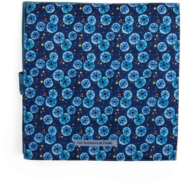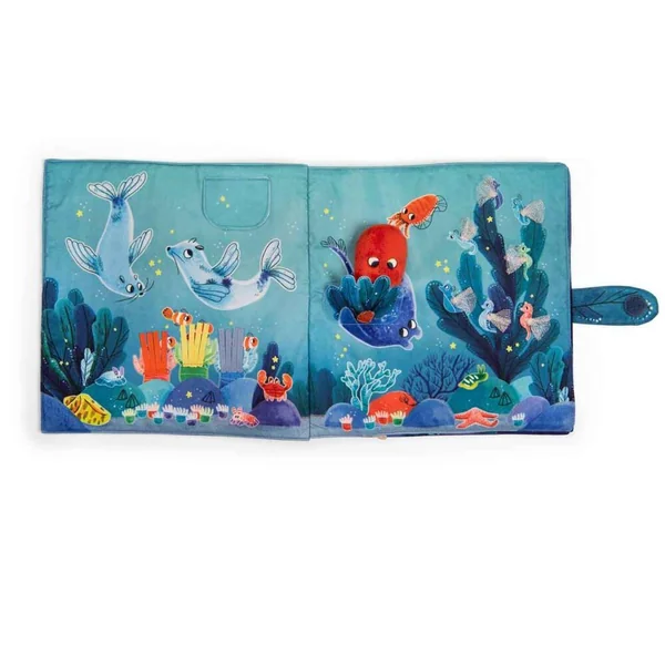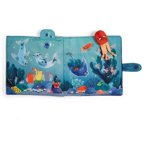 Grand livre en tissu largement illustré intitulé ‘Les aventures de Paulie’. Le hochet poulpe peut se glisser dans une cachette à chacune des 6 pages d’activités sensorielles. Les dernières pages sont phosphorescentes pour illustrer les fonds marins.