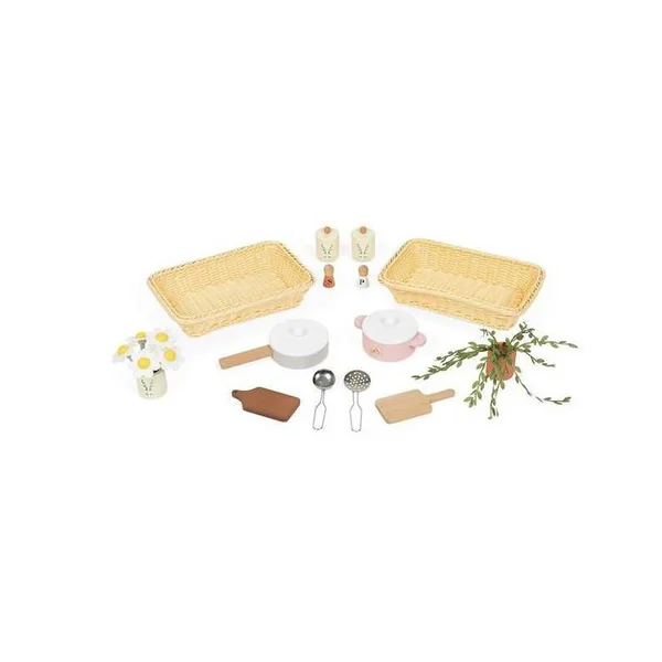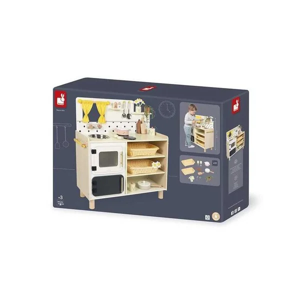 Son style est inspiré de la cuisine de grand-mère, avec tous les indémodables que l’on adore retrouver encore aujourd’hui : 2 planches à découper, 1 poêle, 1 casserole, 1 écumoire, 1 louche, 1 salière, 1 poivrière, 2 pots à épices, 2 grandes panières, des rideaux, 1 vase avec 1 bouquet de 5 fleurs, 1 plante verte. Avec tous leurs ustensiles, les enfants préparent les ingrédients, les font mijoter et les assaisonnent selon leurs goûts, le tout dans leur propre cuisine rien qu’à eux. Mais ce n’est pas tout ! La cuisinière est aussi équipée de 2 fours avec portes magnétiques (parfait pour faire griller de la viande et cuire un bon gâteau en même temps), d’un évier avec boutons rotatifs pour le robinet, de plaques de cuisson avec boutons rotatifs sonores, de deux porte-torchons et d’une fenêtre. Parfait pour rincer les légumes ou laver la vaisselle avec une jolie vue ! La richesse des détails et le grand format de cette cuisine en bois sont un vrai coup de cœur ! Un autre de ses atouts : les charnières inédites des fours, anti-casse et pensées pour un assemblage facile. Il ne reste plus qu’à se mettre aux fourneaux pour faire un gratin de pommes de terre gourmand ou une bonne tarte aux pommes ! Cette grande cuisine pour enfant est composée de bois issu de forêts gérées durablement, certifié ***.