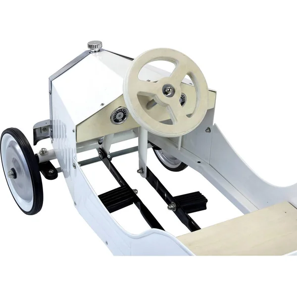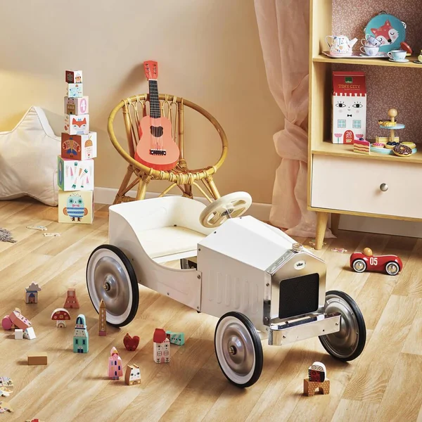 Un bolide élégant et intemporel pour partir à l’aventure ! Grande voiture à pédales en métal – Finition laqué couleur ivoire et éléments en bois naturel.