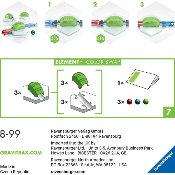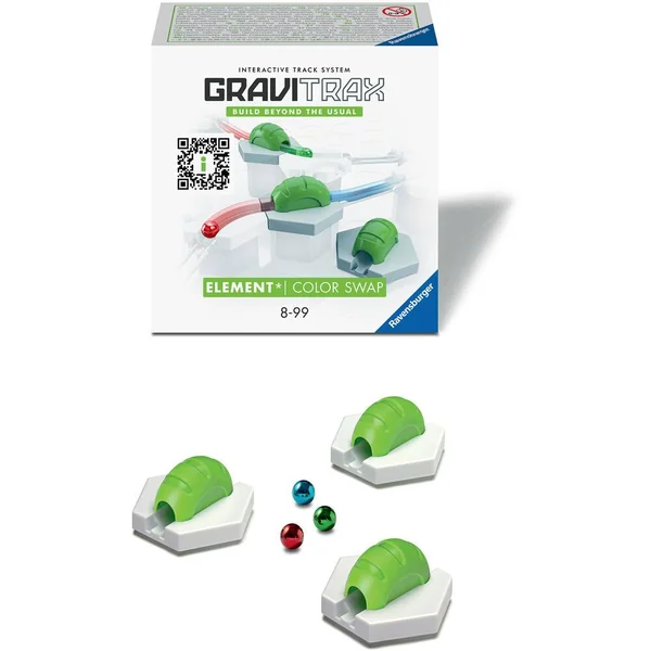 Booste tes circuits GraviTrax avec cet ingénieux bloc d’action qui donnera l’illusion de changer la couleur d’une bille. Par un astucieux tour de passe-passe, la bille rentre à l’intérieur du bloc et ressort d’une autre couleur. Un tour de magie facile à maîtriser, mais qui donnera à coup sûr un effet spectaculaire dans un circuit de billes GraviTrax ! Cet élément se joue avec au moins un Starter Set et peut ensuite se combiner avec tous les produits GraviTrax. Contenu : 1 Élément Colour Swap, 3 billes, 1 guide d’utilisation illustré.