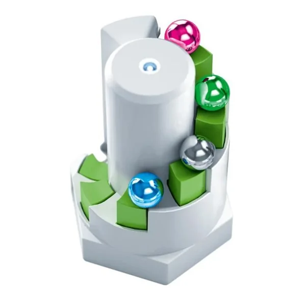 Cet incroyable escalier en colimaçon fonctionne grâce à une assistance électronique qui lui permet de monter des billes de plusieurs niveaux, à l’infini ! Il permet ainsi de prolonger le temps de parcours de tes billes, voire même de découvrir le mouvement perpétuel en imaginant des circuits de billes électroniques et continus qui tournent à l’infini !