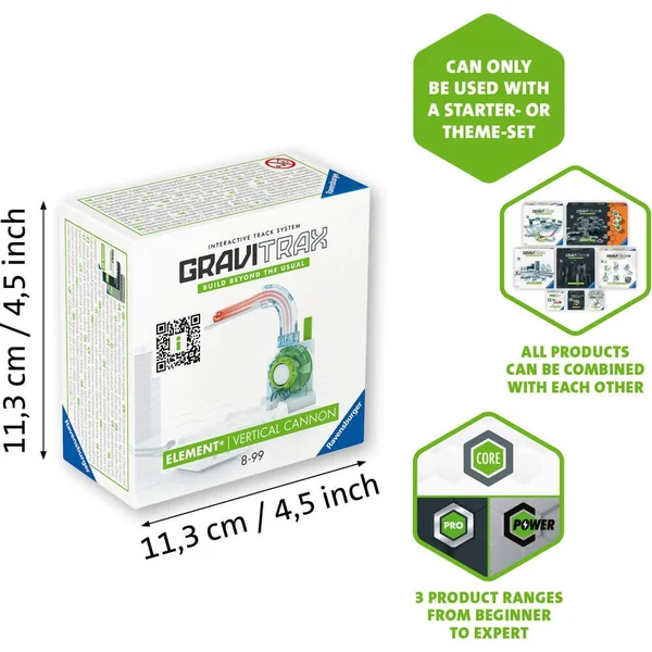 Encore plus d’action avec l’élément Vertical Canon. Cet élément d’action permet de franchir différentes hauteurs de façon spectaculaire.Découvre une nouvelle dimension sur ton circuit de billes avec l’élément Vertical Canon ! Cet élément permet de surmonter les différences de hauteur. Un aimant puissant provoque une réaction en chaîne : dès qu’une bille roule à l’intérieur au niveau le plus bas, elle déclenche une autre bille qui continue à rouler à une hauteur impressionnante.Combiné avec n’importe quel set de démarrage GraviTrax, le Vertical Canon met de l’action et montre de manière ludique les lois de la physique.