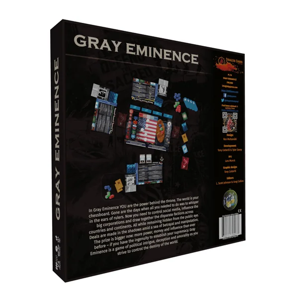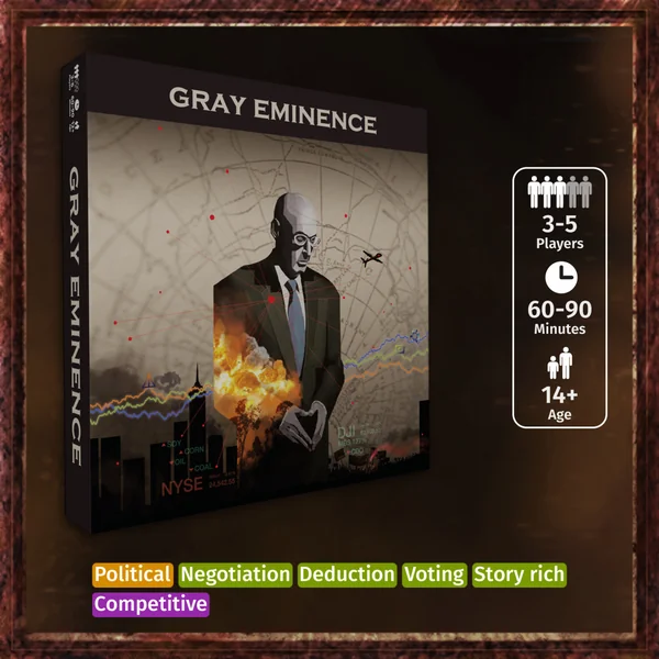 Gray Eminence est un jeu pour 3 à 6 joueurs qui se déroule dans l’arène politique moderne et dure entre 60 et 90 minutes. Des individus secrets, cachés dans l’ombre, utilisent l’argent, le pouvoir et l’influence pour orienter de multiples factions, telles que les Fondations et les Corporations, vers leurs propres objectifs insondables. C’est dans le cadre de ces principes que les joueurs jouent le rôle de ces puissants marionnettistes, chacun travaillant à des objectifs communs ainsi qu’à son propre objectif secret.